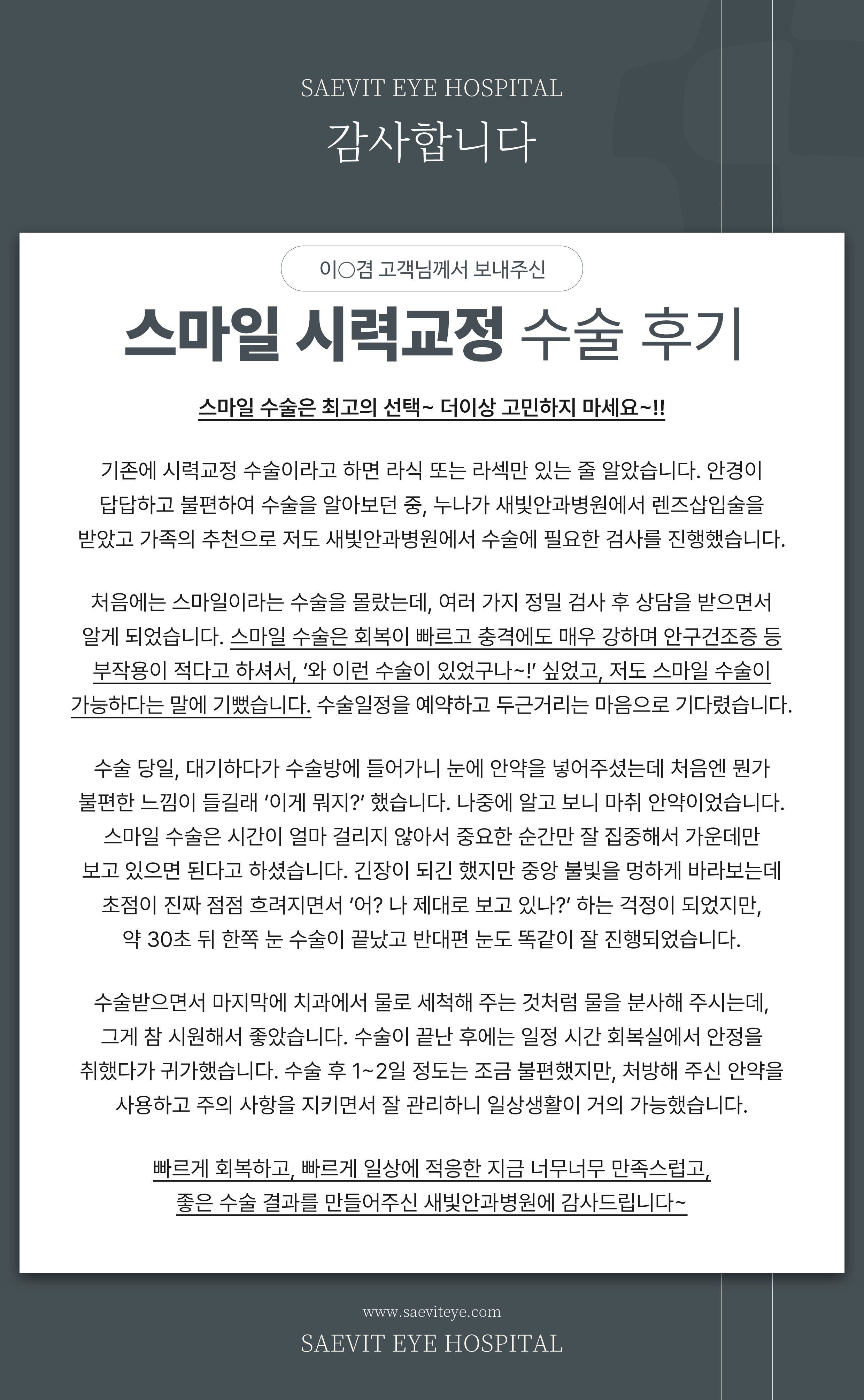 새빛안과병원을 이용하시면서 궁금하셨던 부분, 건의사항 및 칭찬사항을 수렴하는 공간입니다. 더 나은 의료서비스 제공을 위하여 환자 여러분의 그 모든 목소리에 귀 기울이겠습니다.