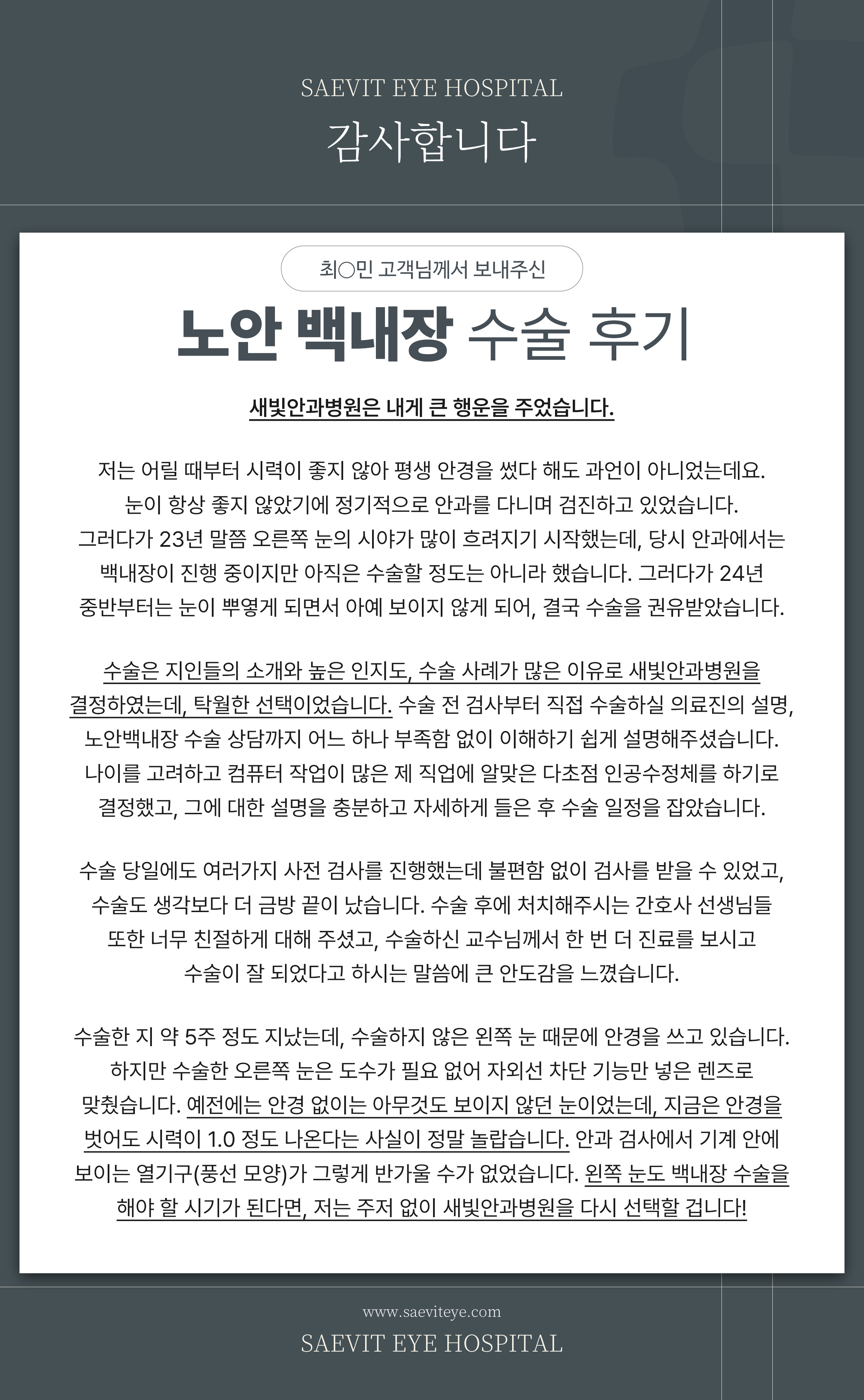 고객서비스 병원소개 전문·클리닉 진료안내 고객서비스 예약·상담 고객치료후기 4 증명서발급안내 고객치료후기 자주하는질문 고객의소리 Customer Service 고객서비스 새빛안과병원을 이용하시면서 궁금하셨던 부분, 건의사항 및 칭찬사항을 수렴하는 공간입니다. 더 나은 의료서비스 제공을 위하여 환자 여러분의 그 모든 목소리에 귀 기울이겠습니다.